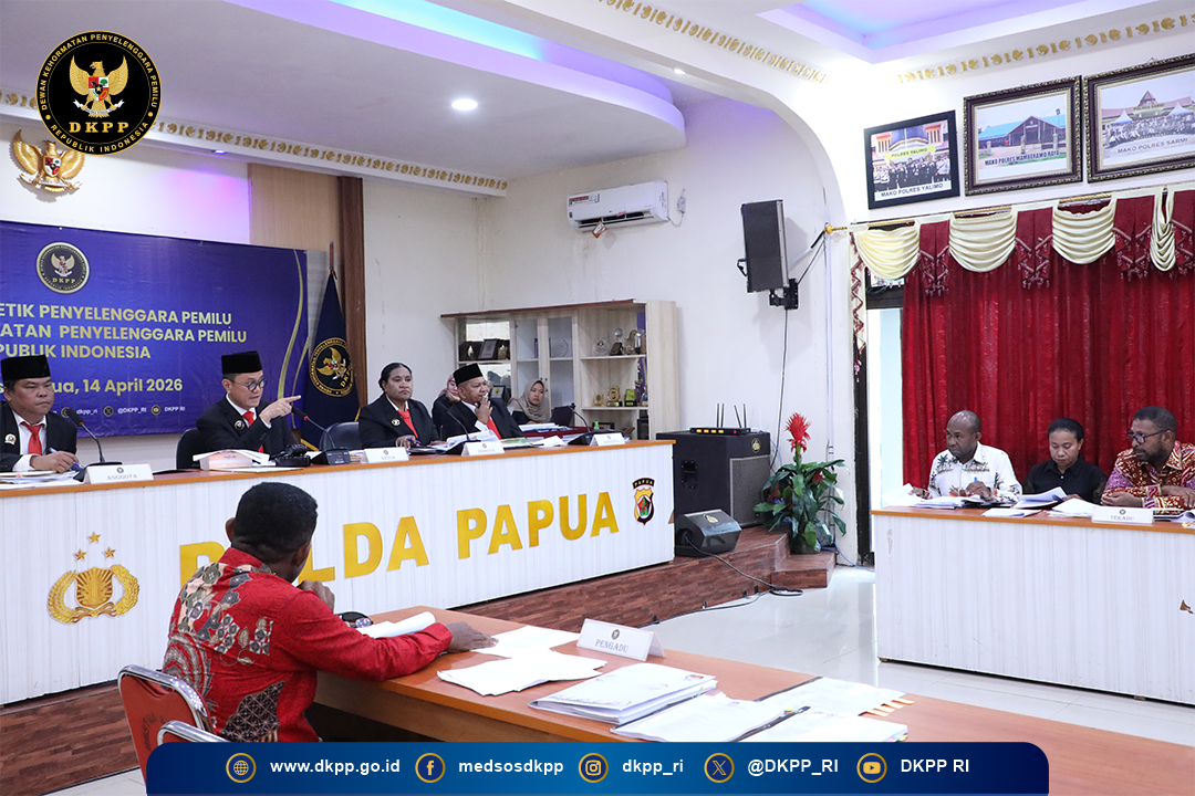 Jayapura, DKPP – Dewan Kehormatan Penyelenggara Pemilu (DKPP) menggelar sidang pemeriksaan dugaan pelanggaran Kode Etik Penyelenggara Pemilu (KEPP) perkara Nomor 5/PKEDKPP/III/2026 di Polda Papua, Kota Jayapura, Selasa (14/4/2026). Perkara ini