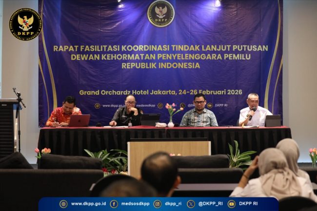 Jakarta, DKPP – Dewan Kehormatan Penyelenggara Pemilu (DKPP) menggelar Rapat Fasilitasi Koordinasi Tindak Lanjut Putusan Pelanggaran Kode Etik Penyelenggara Pemilu (KEPP) pada 24–26 Februari 2026. Kegiatan ini dibuka oleh Ketua DKPP, Heddy Lugito, yang menekankan pentingnya komitmen penyelenggara pemilu dalam mematuhi dan menindaklanjuti putusan etik DKPP. “Ketika seseorang sudah menjadi penyelenggara pemilu, maka ia harus