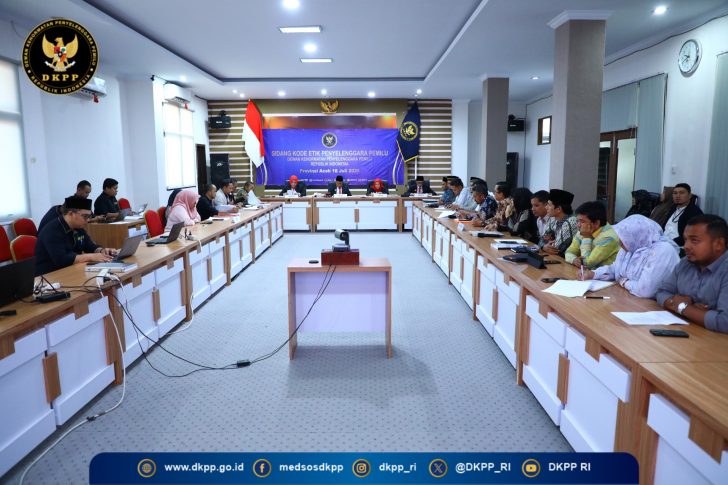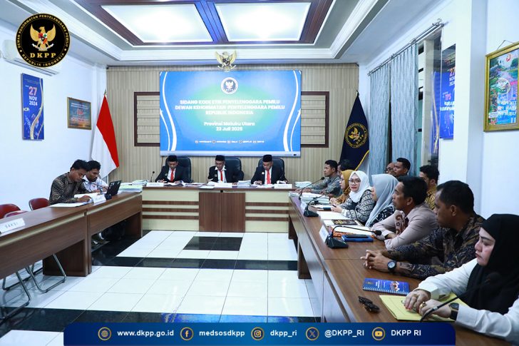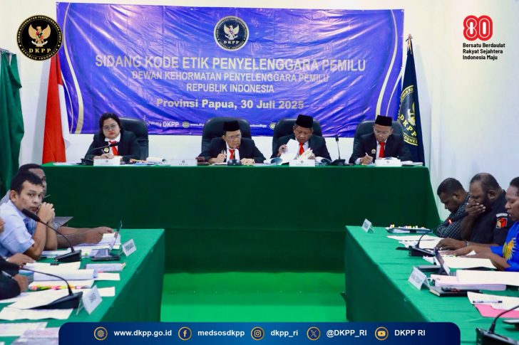 Jayapura, DKPP – Dewan Kehormatan Penyelenggara Pemilu (DKPP) menggelar sidang pemeriksaan dugaan pelanggaran Kode Etik Penyelenggara Pemilu (KEPP) perkara nomor: 131-PKE-DKPP/IV/2025 di Kantor Bawaslu Provinsi Papua, Kota Jayapura, Rabu (30/7/2025).…