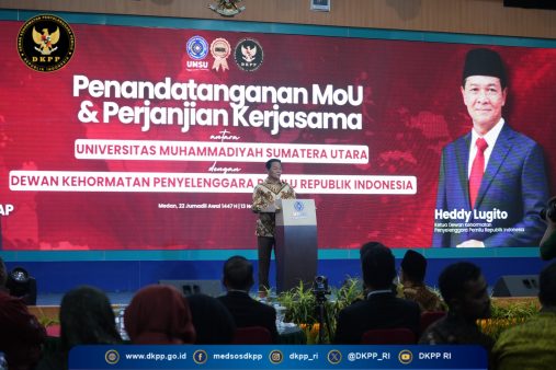 Medan, DKPP – Dewan Kehormatan Penyelenggara Pemilu (DKPP) dan Universitas Muhammadiyah Sumatera Utara (UMSU) menandatangani Nota Kesepahaman atau Memorandum of Understanding (MoU) dan Perjanjian Kerja Sama (PKS) tentang Pelaksanaan Tri Dharma Perguruan Tinggi untuk Penguat Demokrasi dan Integritas Pemilu di Indonesia.
