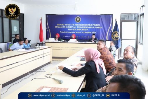 Mamuju, DKPP – Dewan Kehormatan Penyelenggara Pemilu (DKPP) memeriksa Ketua Bawaslu Provinsi Sulawesi Barat (Sulbar), Nasrul Muhayyang, dalam sidang pemeriksaan dugaan pelanggaran Kode Etik Penyelenggara Pemilu (KEPP) untuk perkara Nomor 193-PKE-DKPP/IX/2025 di Markas Polda Sulawesi Barat, Kabupaten Mamuju, Kamis (16/10/2025).