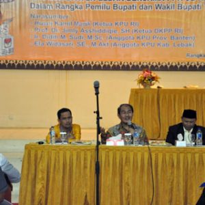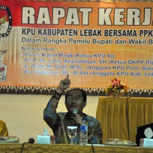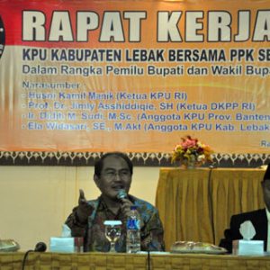 Ketua DKPP Sosialisasi KPU Se_Banten Ketua DKPP Berikan Tips Menghadapi Gugatan di MK *** Pilih Pengacara Top Lebak, DKPP Ketua Dewan Kehormatan Penyelenggara Pemilu Jimly Asshiddiqie memberikan tips menghadapi gugatan hasil Pemilukada di Mahkamah Konstistusi bagi penyelenggara Pemilu. Setiap penyelenggara Pemilu harus mencatat setiap tahapan yang ada dalam Pemilu.